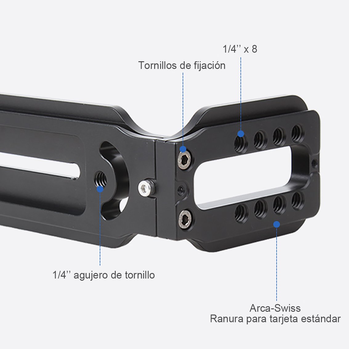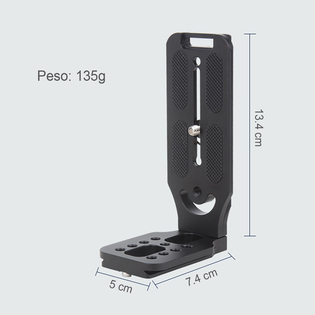 La placa horizontal incorpora un perno estándar de ¼” compatible con casi todas las cámaras del mercado. La placa vertical incorpora múltiples roscas estándar de ¼”, compatible con la mayoría de los trípodes, estabilizadores y gimbals del mercado.