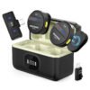 - Funda de carga con batería de larga duración: la funda de carga portátil cuenta con una pantalla que muestra el nivel de batería de cada transmisor y una duración prolongada de la batería de 24 horas para sesiones de grabación prolongadas. Cada transmisor, cuando está completamente cargado, puede funcionar hasta 8 horas